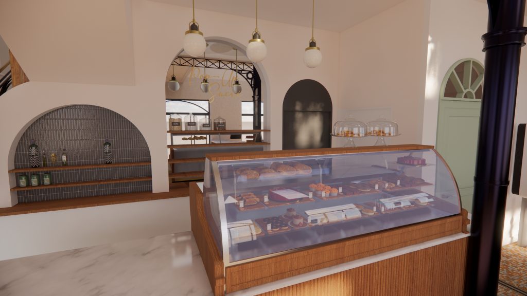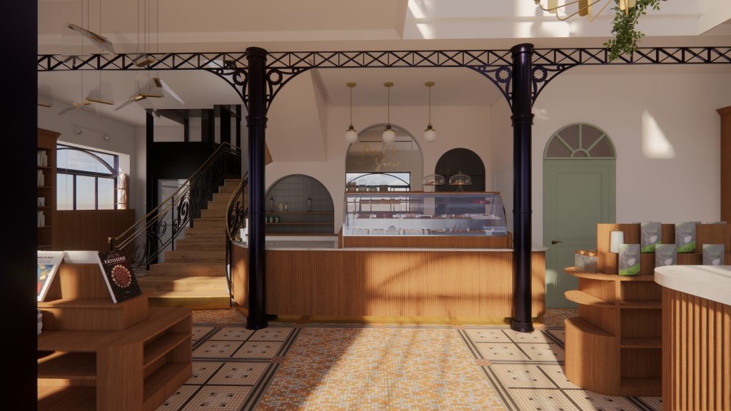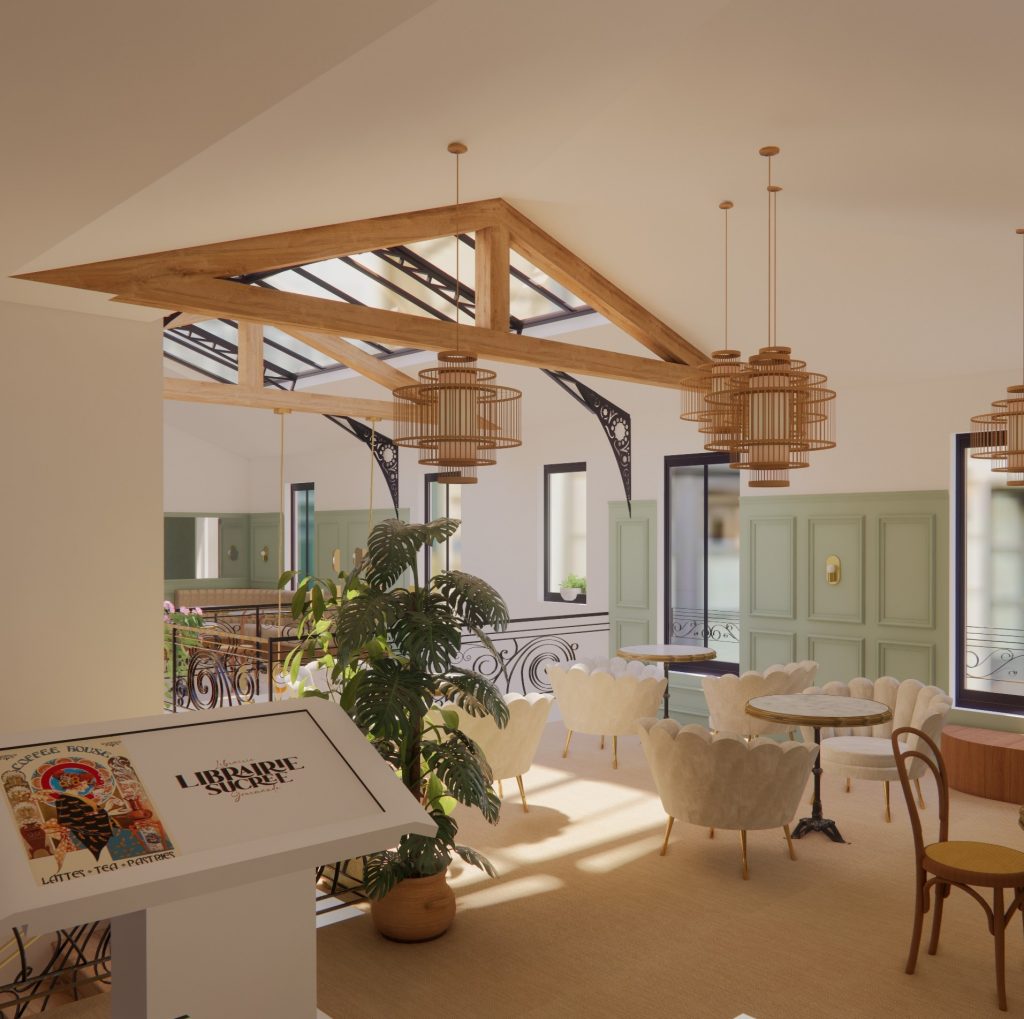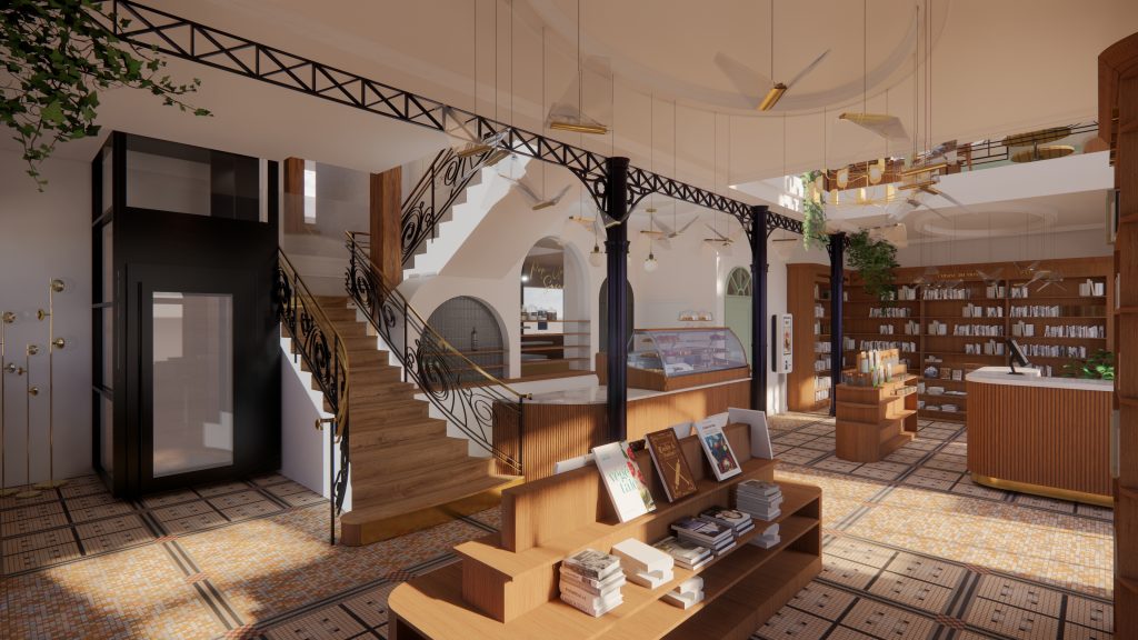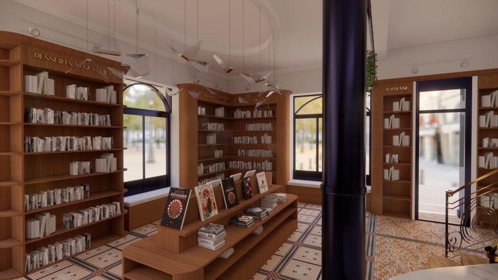 Le décor prolonge cette narration en valorisant l’existant, notamment les carreaux de ciment d’origine, et en associant fer forgé, verre, laiton et velours à des motifs floraux, des miroirs et une palette de verts profonds et de noirs raffinés. Le bois et les plantes viennent réchauffer l’ensemble pour créer une librairie à l’atmosphère intemporelle, immersive et accueillante.